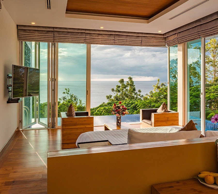 The other remaining two bedrooms feature panoramic views from the bed over the tropical bay below. The bathrooms and private terraces of those rooms share the same views.