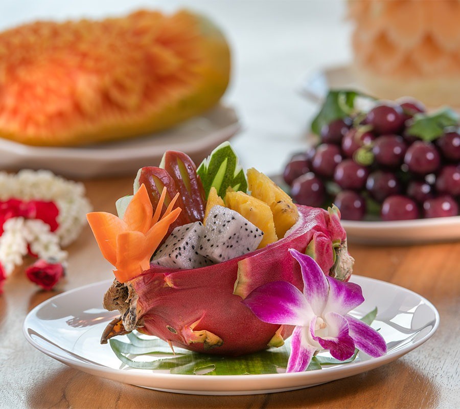 The Indoor dining table can seat up to 10. The menu includes a selection of Thai and Western dish suggestions and can easily adapted to meet individual food preferences and any allergies. All food and beverages are charged at the cost price of the groceries or drinks, plus a 20% surcharge. For more information click here.